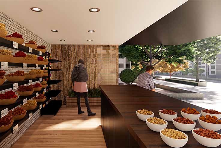 This 20-foot container is a complete store for selling nuts and dried fruit products. It has a counter table and shelves for placing nuts and dried fruit, and two stands for placing packaged products. The two outer walls of this container are opened up to benefit from more space and are used as shades. This container can be used at urban crossings and busy places.