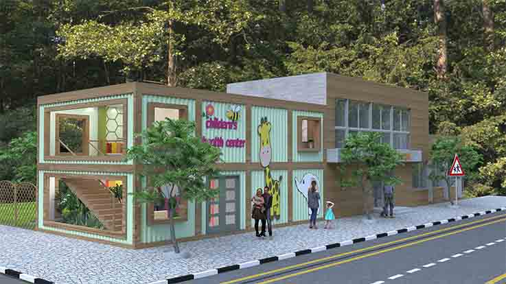 Children's Health Center is designed to accommodate 8, 20-foot containers placed next to each other on two floors. The use of green space in the design, along with cheerful colors and child-friendly shapes, creates a joyful and soothing environment for children. The center comprises sections for general medical care, dentistry, counseling, and triage. Additionally, it features a reception area and two waiting rooms, one on the ground floor and another on the first floor. This center is well-suited for placement next to schools as well as in rural areas and remote locations. Among its accessories are a doctor's desk, reception desk, chairs and benches, dental unit, beds, and other medical equipment.