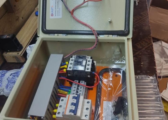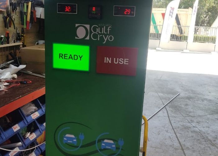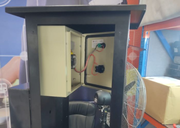 The Future Sky team designed and constructed a metal cabin for the charger station and painted it to prevent corrosion. A temperature sensor (SAMWON SU103SR) and a humidity sensor (SAMWON SU-503BN) were installed to control the temperature and humidity inside the kiosk. If the temperature rises too high, six fans located on both sides of the kiosk will start working. An air inlet is also included on both sides of the kiosk for air circulation. The Tesla charging cable comes out of the back of the kiosk and is placed in a special compartment. A timer (SAMWON CNT-400-2P) shows how long the charger has been removed and used. An AUTONICS CR18-8DN2 capacitive sensor is used to detect the presence of a vehicle. The kiosk was covered with outdoor stickers and the logo of the ordering company was placed on it.