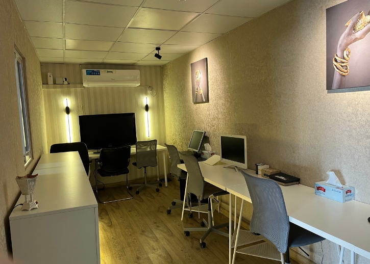 To meet the client's request, we have developed a solution that involves converting a 20-foot shipping container into a smart office room. The container walls have been covered with gypsum, the ceiling with gypsum tiles, and the floor has been fitted with parquet. The exterior of the container is made of foam board and stickers, while the window is made of aluminum. The smart system used in the office room is from the Fibaro brand, and the air conditioning and lighting can be controlled through a mobile device. The office room is equipped with motion detectors that automatically turn on the lights when someone enters the room. The furniture is from the Ikea brand and has an alarm bell that can be used to call employees if necessary. The office room is well-insulated and properly ventilated to ensure a comfortable working environment for employees.