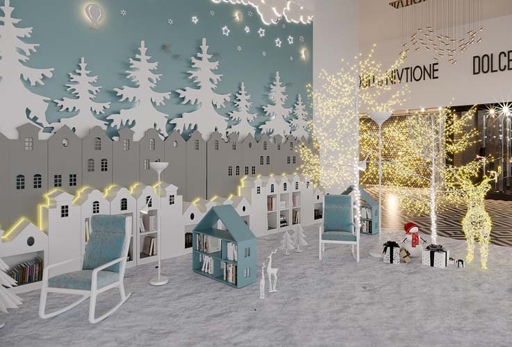 There are chairs placed next to this wall. The floor of this complex is covered with white carpet, which represents the snow in the winter and also this helps to warm the area. In the other part of this collection, deer and trees with smart lighting are placed, all of which are used as symbols for Christmas.